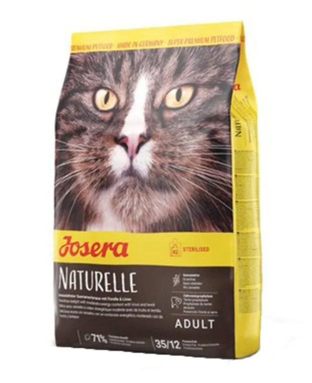 غذای خشک دنتال ناتورله گربه بالغ جوسرا با طعم مرغ و ماهی قزلآلا (Josera Naturelle Adult Dry Cat Food With Chicken & Fish)، با استفاده از گوشت مرغ و ماهی قزلآلا و دستور العملی بدون غلات با چربی متوسط ساخته شده و یک وعده غذایی کامل و با کیفیت برای گربههای سالم و یا عقیم شده میباشد. یک غذای متعادل و کامل برای گربه های بالغ مستعد چاقی (گربه های درون خانه و گربه های عقیم شده) است که مصرف آن به کاهش وزن کمک کند. محتوای انرژی متوسط میتواند از اضافه وزن جلوگیری کند. یک انتخاب هدفمند از مواد تشکیل دهنده باعث تنظیم مقدار اسیدیته ۶ - ۶.۵ میشود که با میتواند با تشکیل سنگهای ادراری مقابله کند. فرمولاسیون خاص این غذا و وجود کلسیم موجب افزایش بهبود سلامت دندانها شده و خطر ابتلا به تارتار را کاهش میدهد. عدم وجود غلات در این محصول، آن را به غذایی مناسب برای گربه های دارای گوارش حساس تبدیل کرده است.